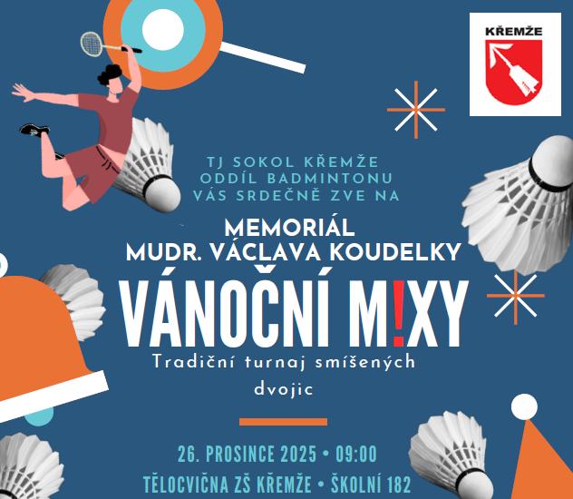 TJ Sokol Křemže srdečně zve všechny badmintonové příznivce na tradiční Vánoční mixy – Memoriál MUDr. Václava Koudelky, který se uskuteční 26.12.2025. Oblíbený turnaj smíšených dvojic startuje od 9,00 v tělocvičně ZŠ Křemže.